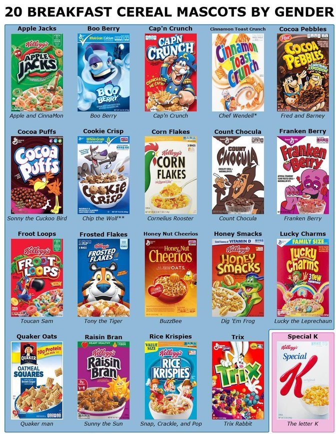 Most cereal mascots are boys, but there are some girl characters too! It’s important to have both so all kids can see characters like themselves on cereal boxes.